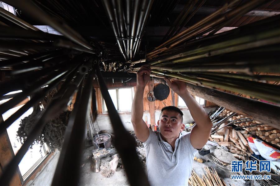 5月30日,在融水苗族自治縣安太鄉(xiāng)小桑村青山屯,杜信文在挑選熏干的竹子準備做蘆笙。