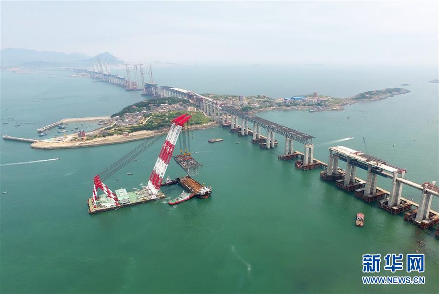 5月12日,“大橋海鷗號”起重船在吊裝一孔簡支鋼桁梁(無人機拍攝)。新華社記者 林善傳 攝