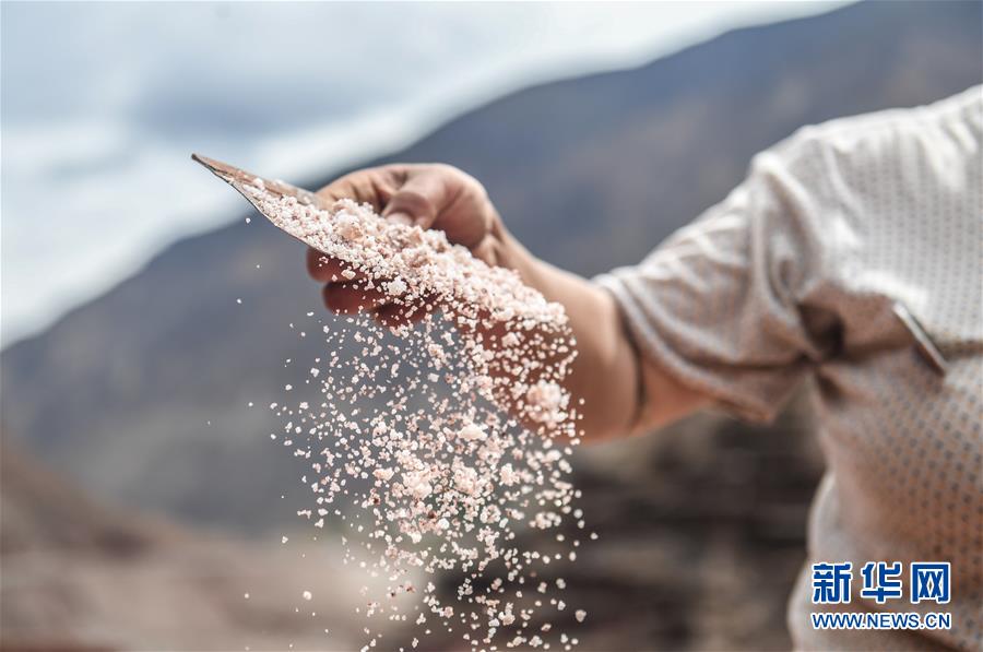 西藏芒康縣納西民族鄉加達村一名村民在收集鹽田曬的鹽(6月4日攝)。新華社記者晉美多吉攝