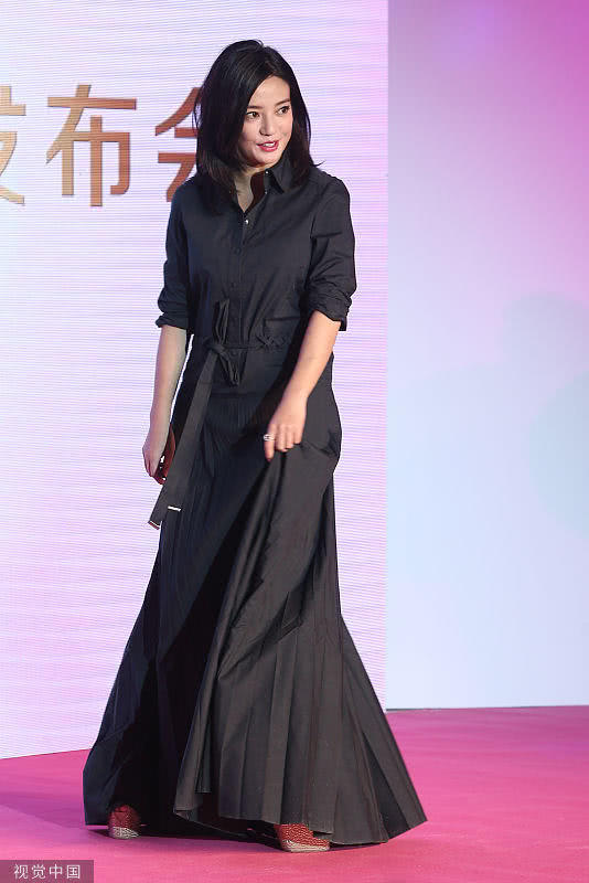 趙薇一身黑色長裙現身發布會現場,化著淡妝的她看起來氣色不錯。趙薇的臉頰圓潤,看起來比影視劇中胖了不少。