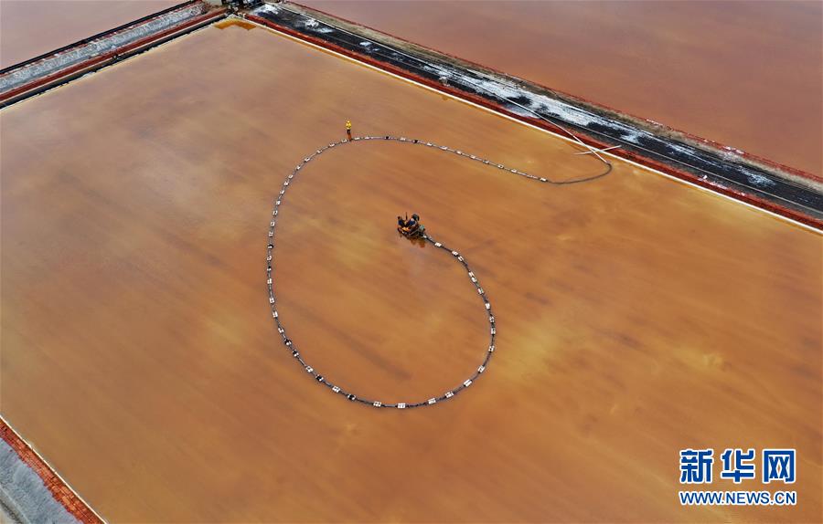 7月3日,唐山海港經濟開發區大清河鹽場的工人在操作機械設備收獲春鹽(無人機拍攝)。新華社記者 楊世堯 攝
