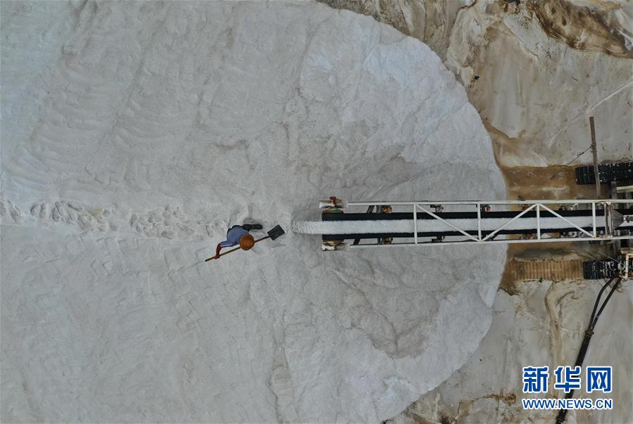 7月3日,唐山海港經(jīng)濟(jì)開發(fā)區(qū)大清河鹽場的工人在鹽堆上工作(無人機(jī)拍攝)。新華社記者 楊世堯 攝