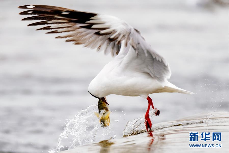 7月6日,在青海省剛察縣沙柳河里,一只棕頭鷗捕捉到一只躍起的湟魚。 新華社記者 吳剛攝