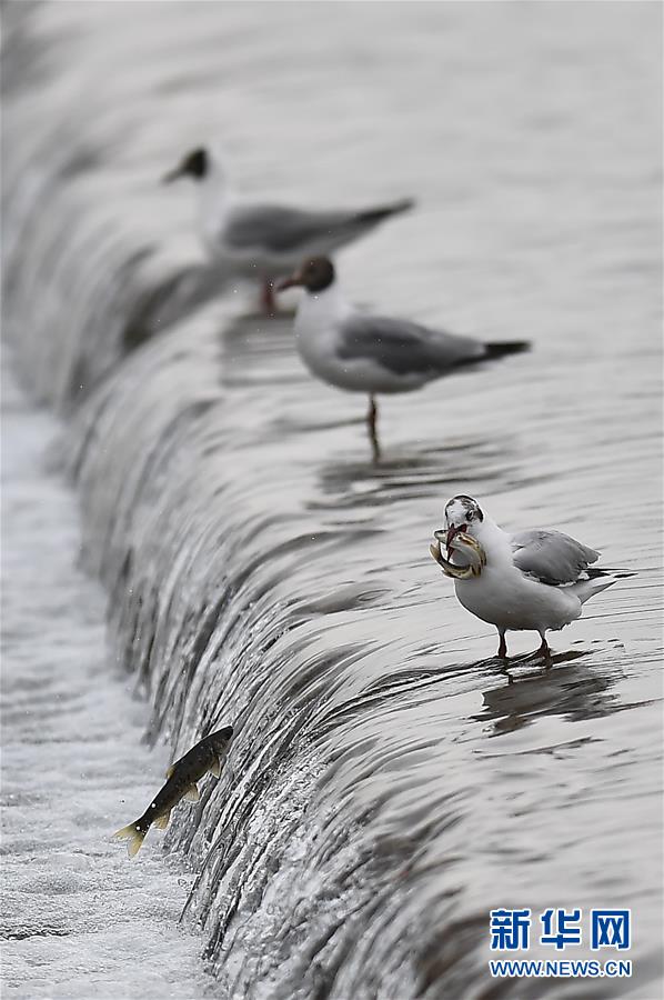 7月6日,在青海省剛察縣沙柳河里,幾只棕頭鷗等待捕捉躍起的湟魚。 新華社記者 費茂華攝