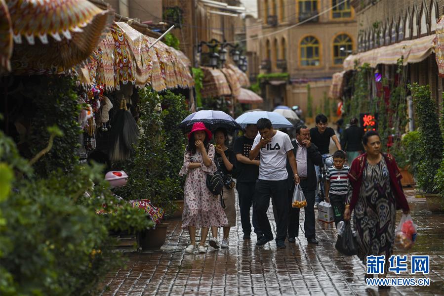 7月7日,游客在雨中的喀什古城景區(qū)里參觀。 新華社記者 趙戈 攝