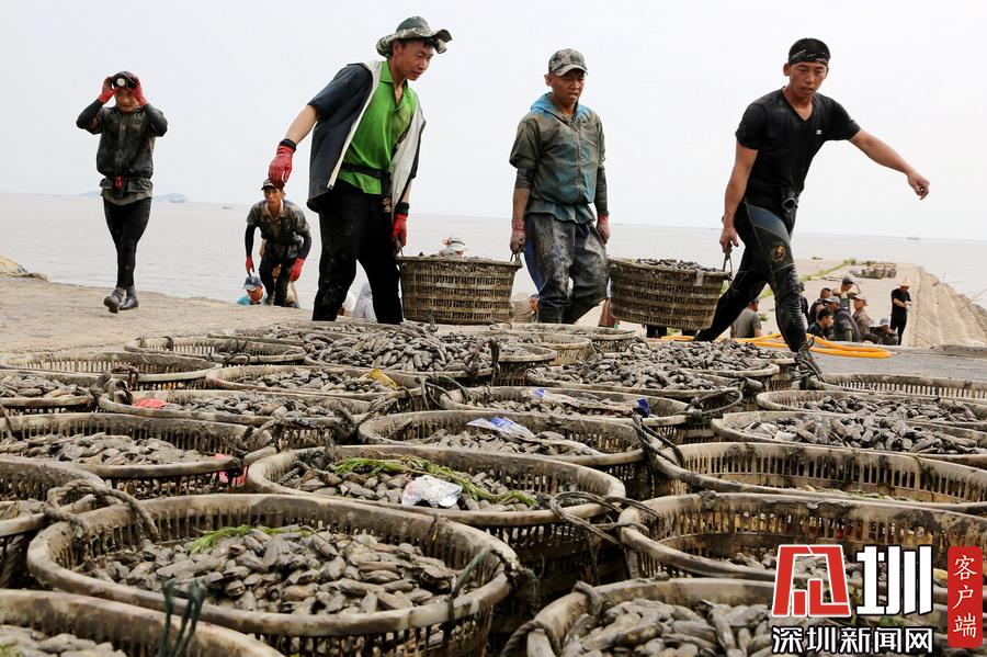 時下正是沿海地區海蟶收獲的季節,在江蘇連云港海邊的灘涂上,漁民們將收獲的海蟶裝箱外運,一片忙碌。