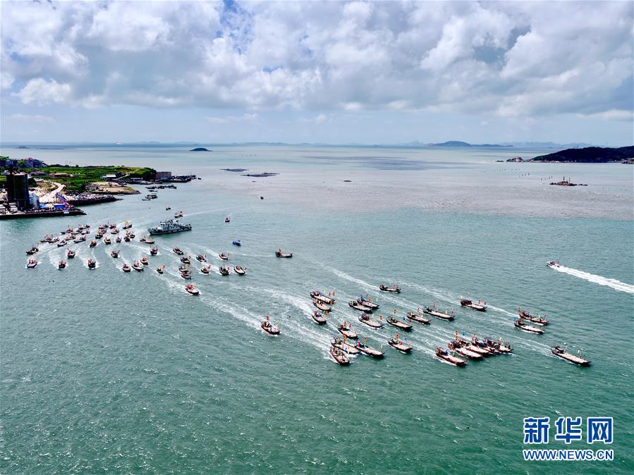 8月3日,在首屆福清開漁節上,漁船駛向大海(無人機拍攝)。新華社記者姜克紅攝