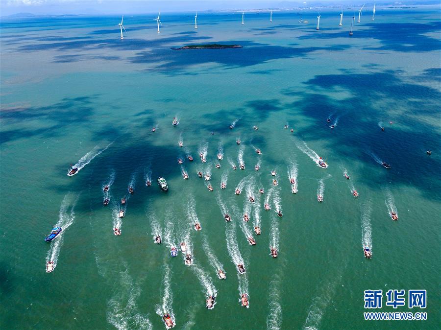 8月3日,在首屆福清開漁節上,漁船駛向大海(無人機拍攝)。新華社記者姜克紅攝