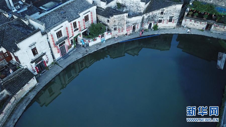 這是8月4日無人機拍攝的安徽黟縣宏村風景區月沼晨景。新華社記者 張端 攝