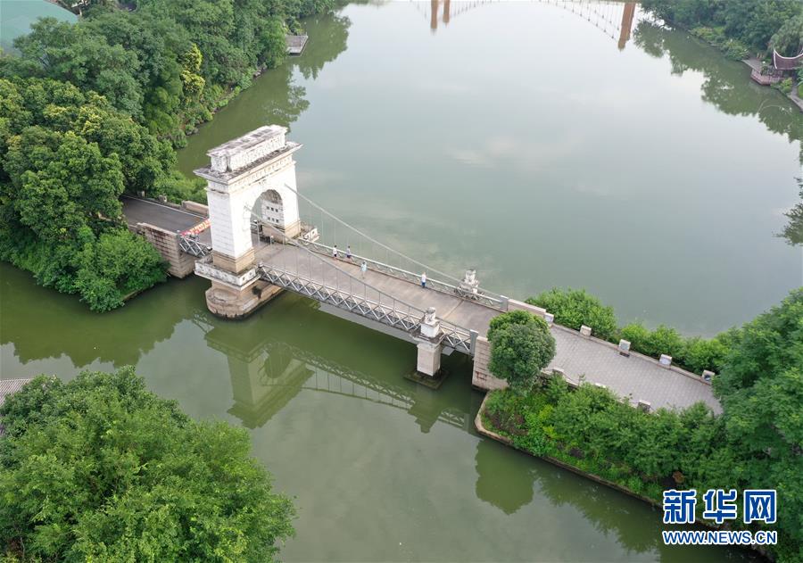桂林市榕湖上的橋梁(7月1日無人機拍攝)。 夏日時節,廣西桂林市區內的榕湖、杉湖、桂湖、木龍湖等地綠樹成蔭、景色迷人。 新華社記者陸波岸攝