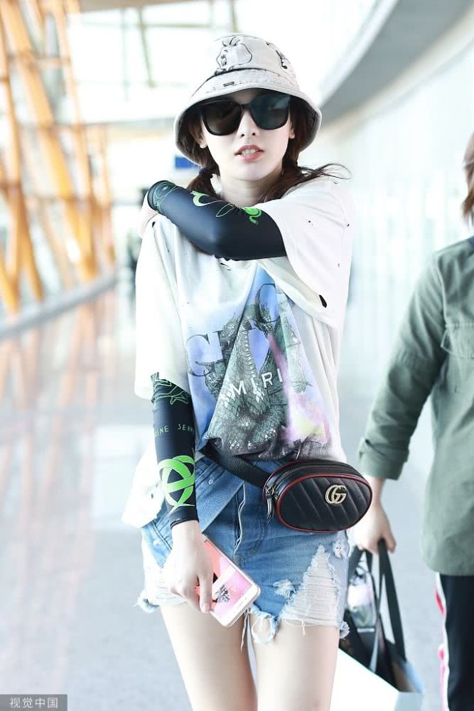 內地女星彭小苒現身機場,穿印花T恤牛仔短褲,白色馬丁靴很時髦