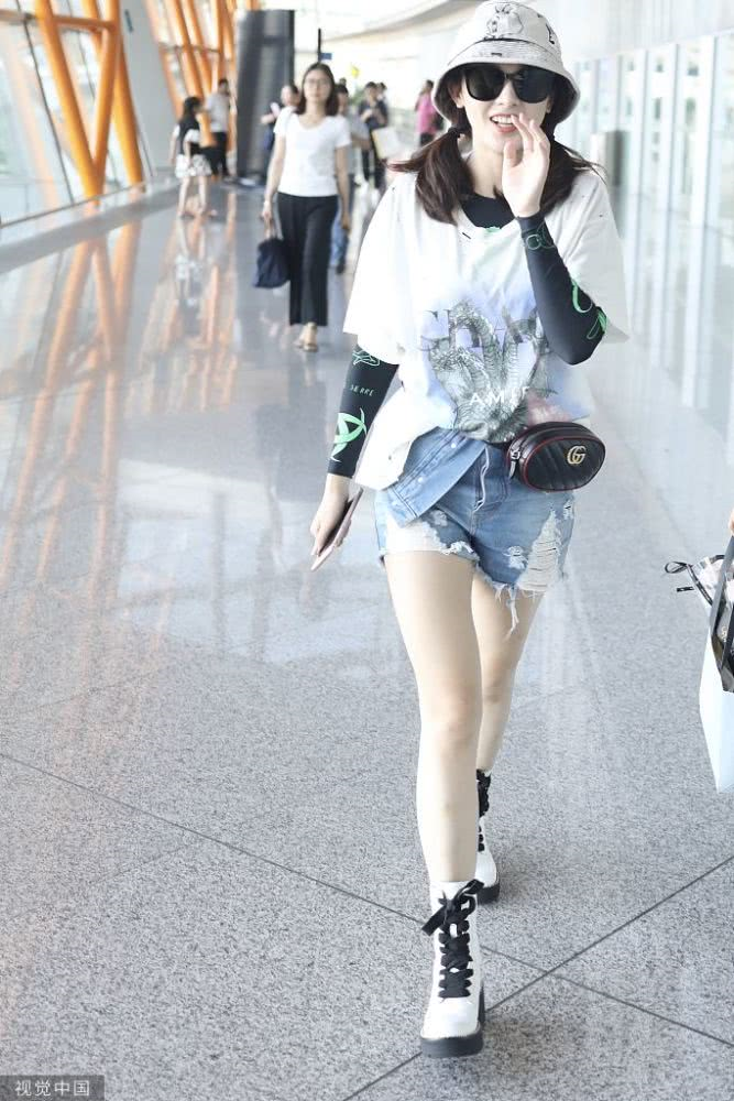 內地女星彭小苒現身機場,穿印花T恤牛仔短褲,白色馬丁靴很時髦