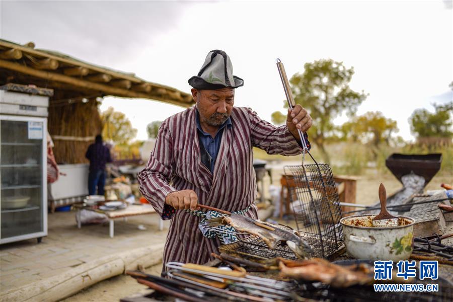 羅布人村寨位于新疆巴音郭楞蒙古自治州尉犁縣,塔里木河從這里流過,沙漠、胡楊、湖泊的奇妙組合吸引了不少游客。生活在這里的羅布人阿木東·艾不東更成為大家關注的焦點。 阿木東·艾不東61歲,聲音洪亮,面色紅潤,平時喜歡穿著羅布麻紡織而成的對襟長袍和羊毛氈制成的船形帽子,這是羅布人的傳統裝扮。 如今,許多羅布人不再以打魚為生,他們有的放牧,有的種植,有的開設店鋪……像阿木東一樣在沙漠中漁獵的羅布人已經很少了。 制作羅布人傳統美食——紅柳烤魚是阿木東的拿手絕活。一根紅柳,穿起一條野魚,起一堆炭火,撒少許鹽巴,就可以靜待皮焦肉嫩的紅柳烤魚了。除了傳統口味外,阿木東對羅布烤魚進行了改良。“我秘制了一種烤魚醬,里面除了辣椒、鹽巴、孜然,還有其他佐料。”當問起具體是哪些配方時,阿木東笑著說:“還有就是塔里木河的味道!” 阿木東是一個閑不住的人。旅游旺季過后,他會制作卡盆(胡楊制作的獨木舟)模型、胡楊筆筒等,等旺季來臨再把這些小物件賣出去。 兩千年前,塔里木河與孔雀河載著天山、昆侖山的雪水,把羅布泊充盈得煙波浩渺。羅布人靠羅布泊水域和周圍的濕地及原始胡楊林繁衍生息。后來,塔里木河下游河床被風沙淤塞,干旱斷絕了綠色。2001年,塔里木河流域近期綜合治理項目啟動。隨著下游河道兩岸地下水位的抬升,相當數量的胡楊從死亡的邊緣“醒來”,重新護佑這里的綠洲與百姓。 近幾年,阿木東生活的地方基礎設施大為改善,柏油馬路修到了塔里木河畔。前來領略大漠胡楊的游客也越來越多。據了解,截至7月底,尉犁縣今年已接待游客78萬人次,旅游總收入超過1.1億元,同比分別增長63.14%和119.42%。 新華社記者 趙戈 攝