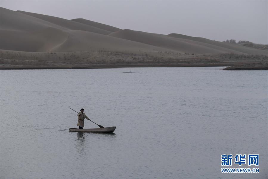 在羅布人村寨,阿木東·艾不東劃著卡盆準備去捕魚(2018年10月16日攝)。新華社記者 趙戈 攝