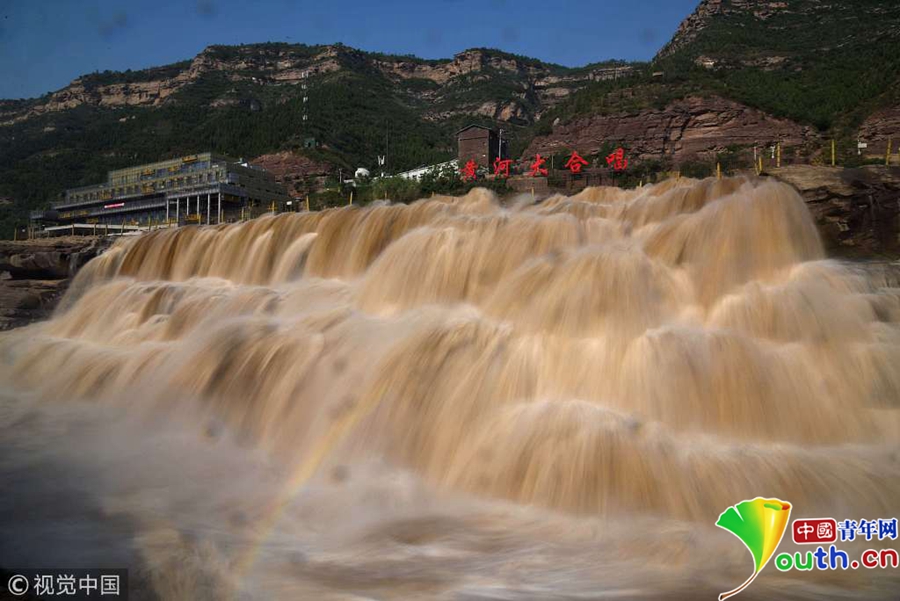 5月31日,山西臨汾奔騰咆哮的黃河壺口瀑布吸引游客。近日,受上游地區降雨量增多影響,黃河干流晉陜峽谷水量大增,每秒流量達到1100立方,是常年同期的三倍,壺口瀑布出現五月份罕見的瀑布群景觀,吸引了眾多游客。圖片來源:視覺中國