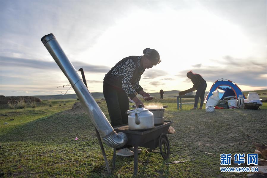 在新疆阿勒泰地區福海縣,牧民在轉場途中生火做飯(6月5日攝)。新華社記者丁磊攝