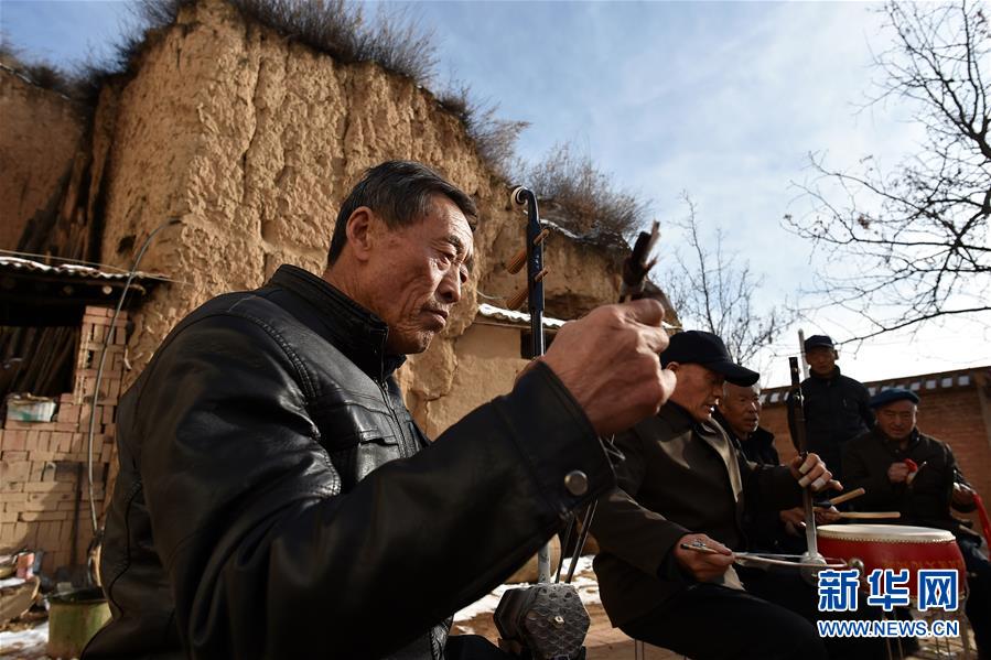 在武鄉縣大有鄉王莊溝村,村民演奏樂器為秧歌隊排練伴奏(2月15日攝)。 新華社記者 詹彥 攝