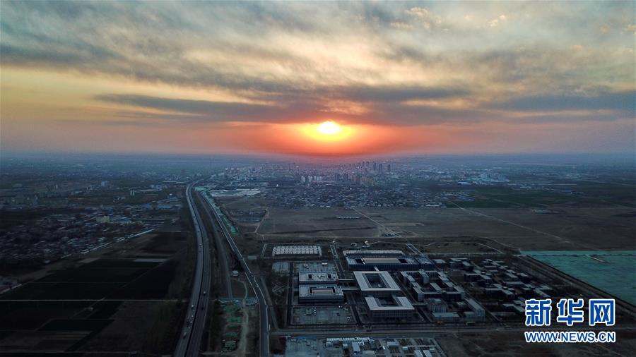 3月31日無人機拍攝的雄安新區(qū)市民服務(wù)中心(前)遠(yuǎn)處為容城縣城區(qū)。新華社記者牟宇攝