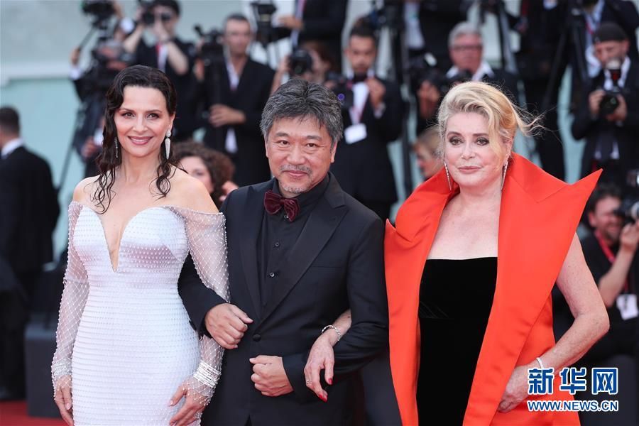 8月28日,在意大利威尼斯,開幕影片《真相》導演是枝裕和(中)攜主演朱麗葉·比諾什(左)與凱瑟琳·德納芙亮相開幕式紅毯。新華社記者 程婷婷 攝