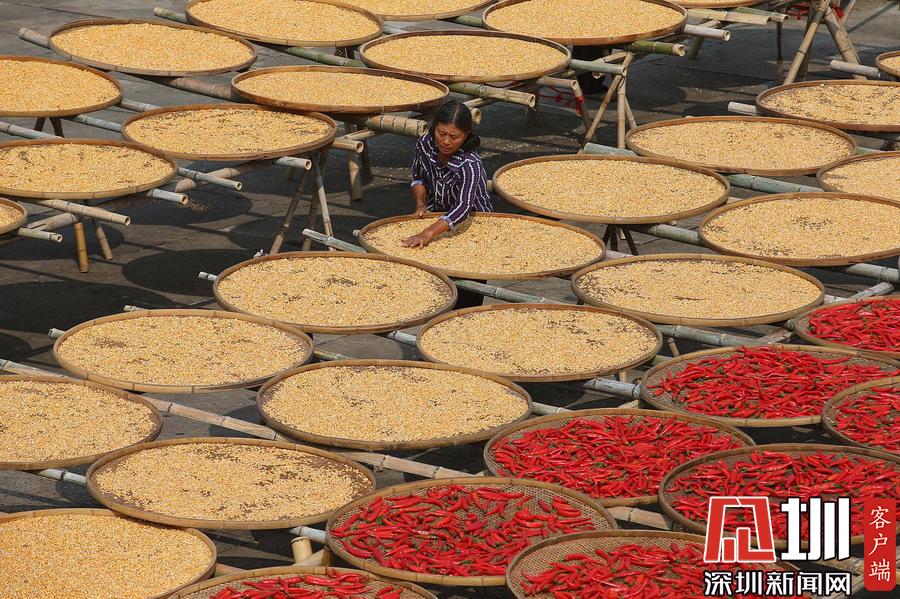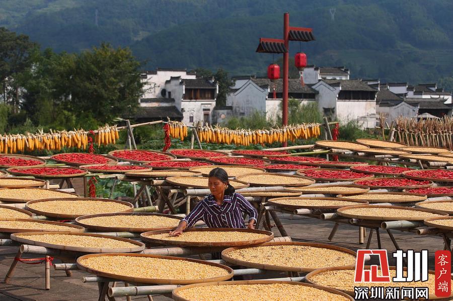 當日立秋節氣,江西婺源縣篁嶺古村的農作物普遍豐收,村民們又迎來了一年一度的“曬秋”季。