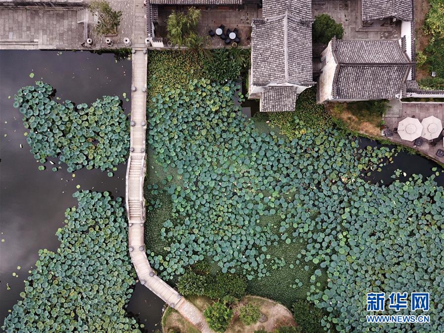 這是無人機拍攝的呈坎村內的荷塘(8月28日攝)。新華社記者劉軍喜攝