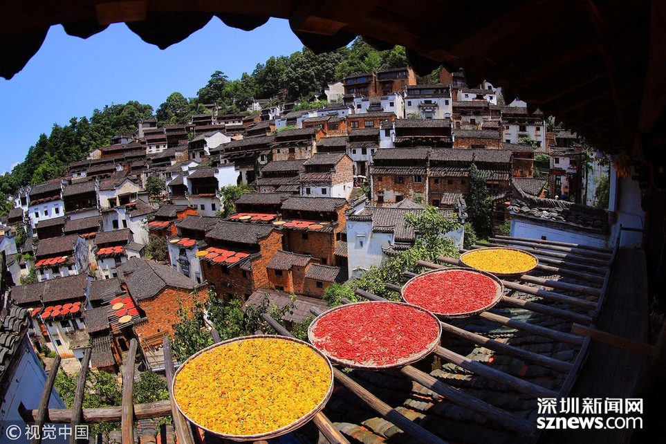 2018年8月7日,江西婺源縣篁嶺古村落,壯觀“曬秋”場景。當日立秋節氣,江西婺源縣篁嶺古村的農作物普遍豐收,村民們又迎來了一年一度的“曬秋”季。村民們將收獲來的紅辣椒、玉米、南瓜、稻谷和菊花等色彩斑斕的農作物,晾曬在依山而建的徽派民居房前屋后的木制曬架上,在秋日陽光的照射下,色彩繽紛圓圓的曬扁,鋪就在錯落有致的徽派民居之間,格外璀璨奪目,蔚為壯觀。目前,“篁嶺曬秋”已經成為中國鄉村旅游的一張名片。