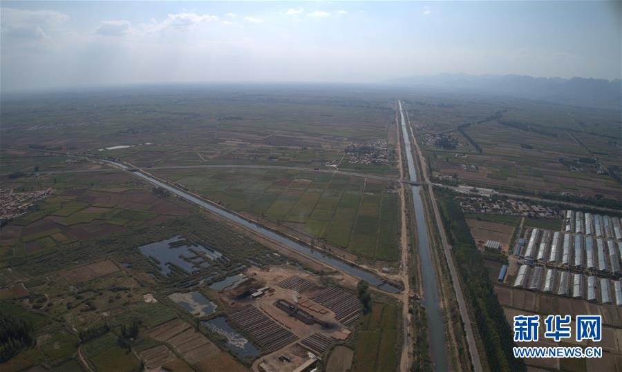 9月4日無人機拍攝的河套灌區第三排干溝(左)排水排入總排干溝(右)。 新華社記者 劉詩平 攝