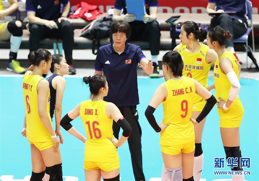 9月22日,中國隊主教練郎平(中)在比賽間隙指導球員。當日,在日本札幌舉行的2019年女排世界杯賽第二階段A組循環賽比賽中,中國隊以3比2戰勝巴西隊。新華社記者杜瀟逸攝
