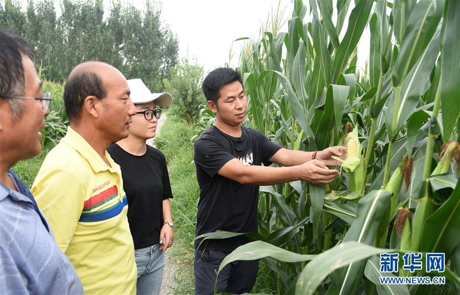 在山東省德州市平原縣的農場玉米地里,楊春雷(右一)、卜璐璐(右二)指導當地農戶學習有關科學種植的知識(8月22日攝)。 新華社記者 王凱 攝