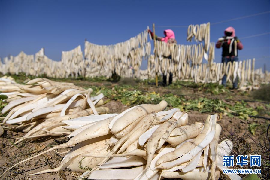 9月30日,寧夏吳忠市紅寺堡區馬渠生態移民安置區的農民在晾曬蘿卜。新華社記者 馮開華 攝