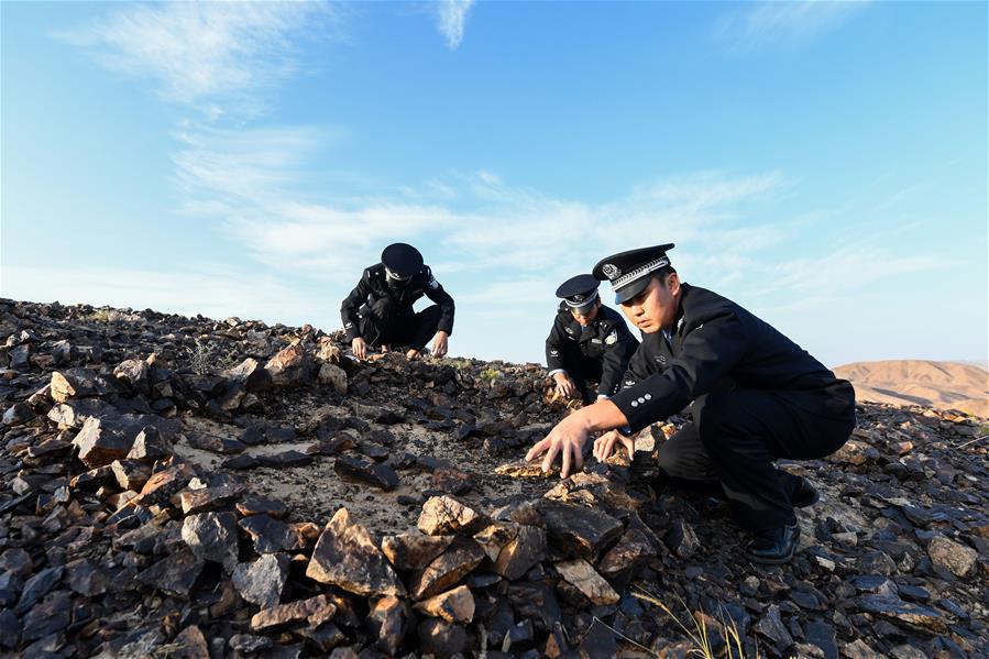 9月27日,內蒙古自治區額濟納旗算井子邊境派出所民警在大紅山上維護整理石塊。新華社記者劉磊攝