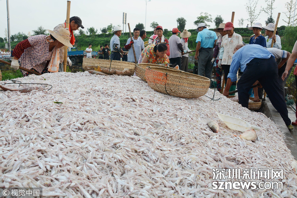 江西都昌縣薌溪鄉的漁民趁著晴好天氣翻曬捕撈上岸的魚蝦。