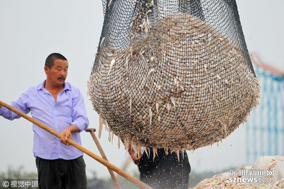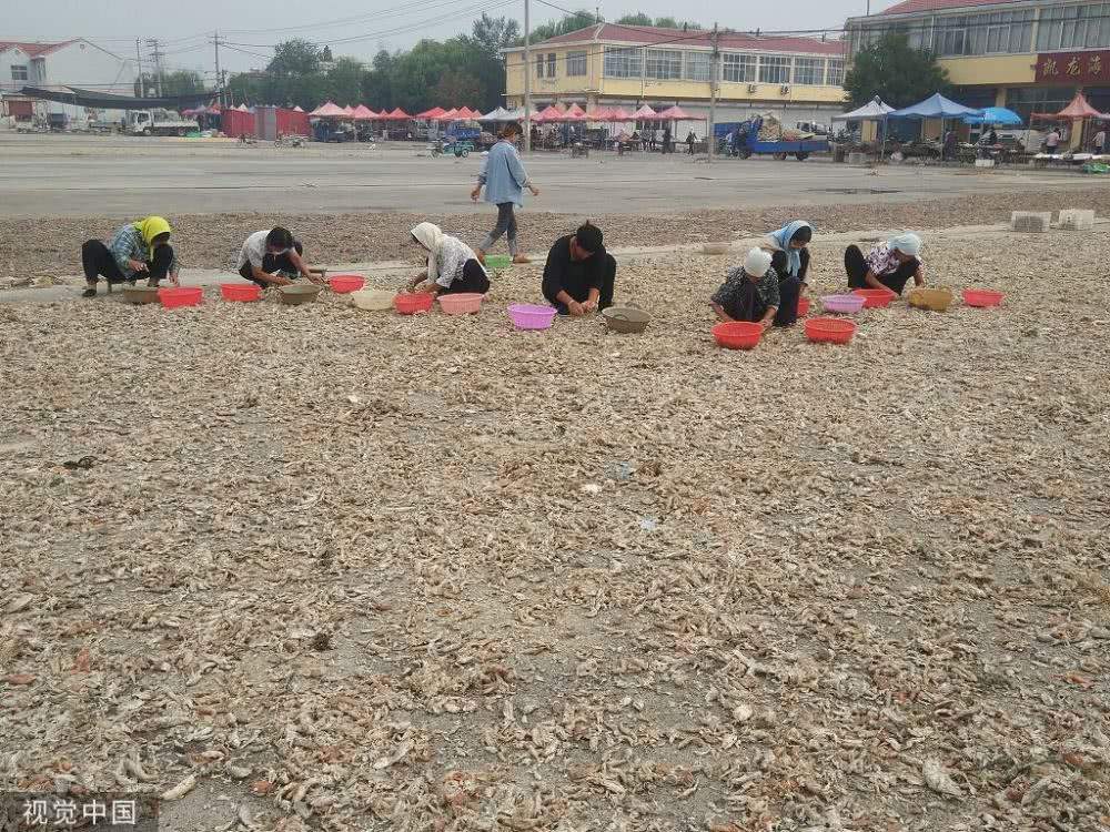 渤海灣畔海產豐收,成群魚蝦分揀后當街晾曬,場面賽曬糧食