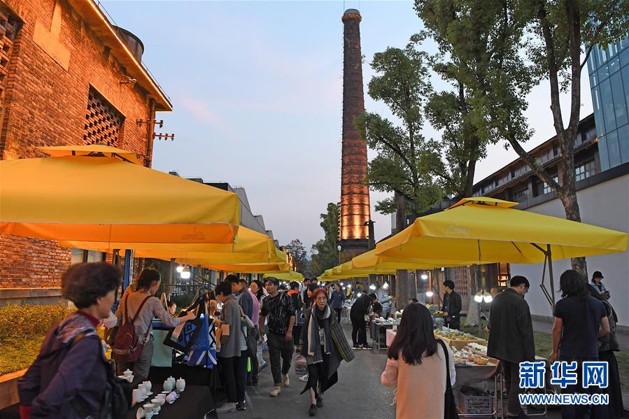 游客在江西景德鎮(zhèn)陶溪川文創(chuàng)街區(qū)內游覽參觀(2016年10月20日攝)。新華社記者 萬象 攝