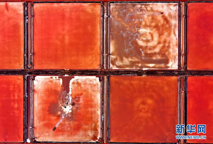 魯北鹽場(chǎng)工人在鹽池中收獲海鹽(10月9日無(wú)人機(jī)拍攝)。新華社記者 朱崢 攝