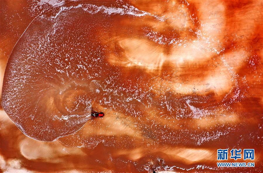 魯北鹽場工人在鹽池中收獲海鹽(10月9日無人機(jī)拍攝)。新華社記者 朱崢 攝
