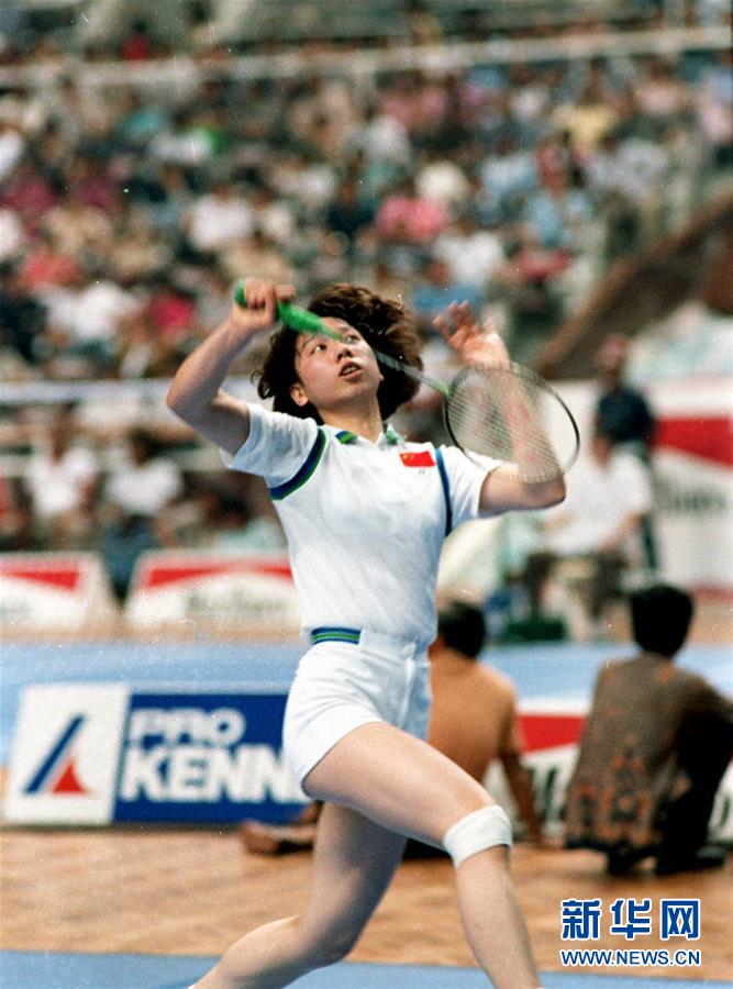 圖為韓愛萍在福州舉行的1986年“登喜路”中國羽毛球公開賽女子單打決賽中擊球(1986年6月1日攝),她最終奪得女單冠軍。新華社記者官天一攝