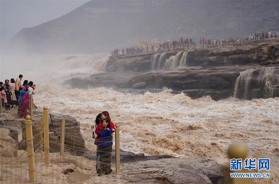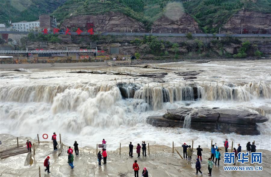 受近日降雨影響,位于山西吉縣的壺口瀑布水量增大,壯美的瀑布群景觀吸引眾多游客前來觀賞。新華社記者楊晨光攝