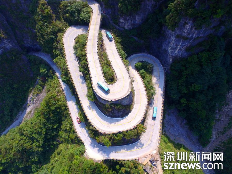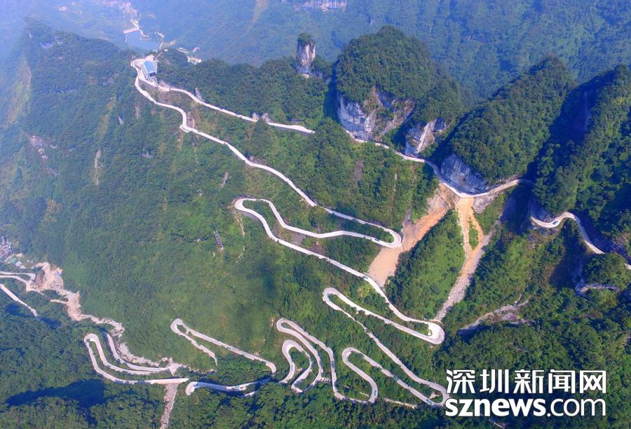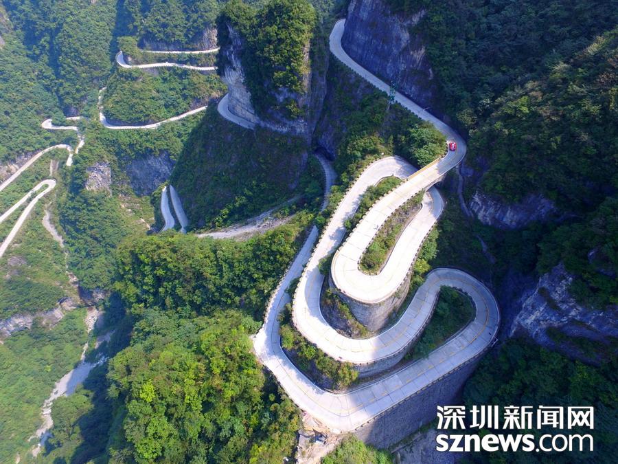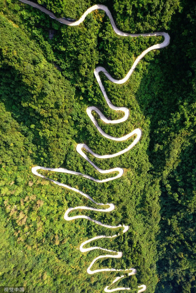 天門山盤山公路位于湖南省張家界市境內的國家森林公園天門山上,盤山公路全長10.77公里,海拔從200米急劇提升到1300米,大道兩側絕壁千仞,空谷幽深,共計99個彎,180度急彎此消彼長,似玉帶環繞,航拍鏡頭下蜿蜒曲折的道路彎彎緊連,層層迭起,宛如迷宮般的“納斯卡線條”,被譽為“天下第一公路奇觀”,同時它也是世界上最危險的十大公路之一。