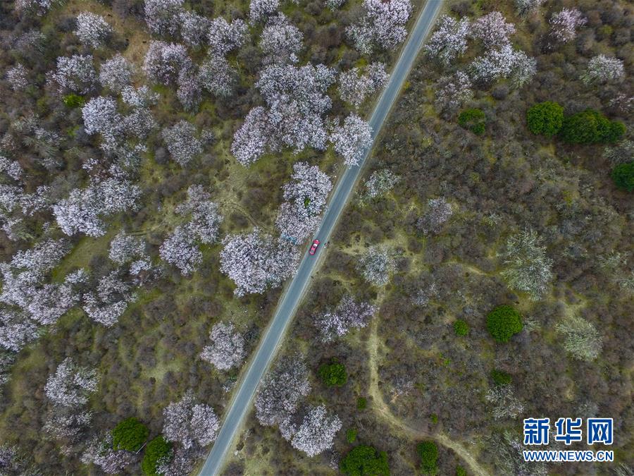 這是經過林芝波密境內桃花叢的公路(2016年4月1日無人機拍攝)。 新華社記者 普布扎西 攝