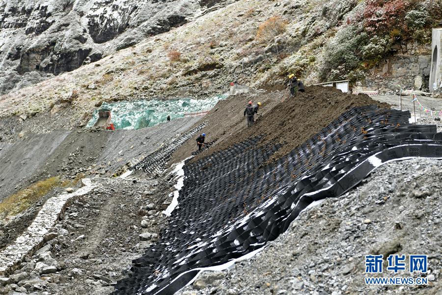 施工人員在鋪設邊坡綠化土工格室(10月24日攝)。新華社記者李鑫攝