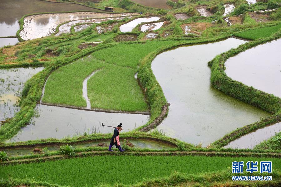 5月18日,農民從貴州省丹寨縣龍泉鎮高要梯田里走過。初夏時節,位于貴州省丹寨縣龍泉鎮的高要梯田景色優美。新華社記者楊文斌攝