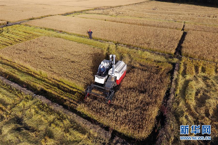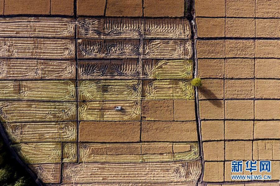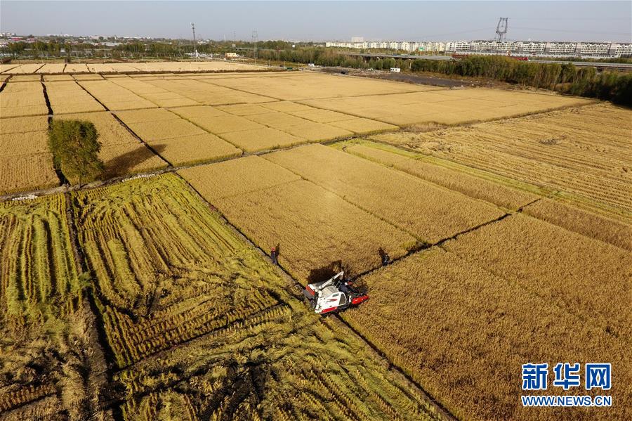 收割機在太原市晉源區赤橋村稻田里作業(10月28日無人機拍攝)。新華社記者詹彥攝