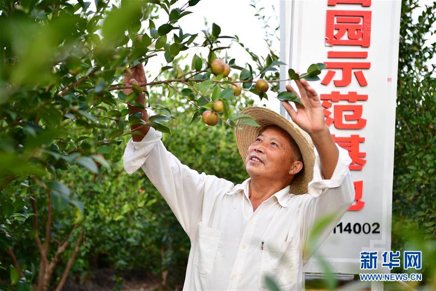 在河南省信陽市光山縣槐店鄉,農民在聯興油茶基地查看油茶果生長狀況(9月4日攝)。新華社記者馮大鵬攝