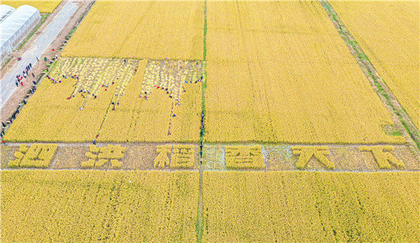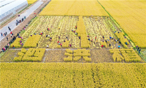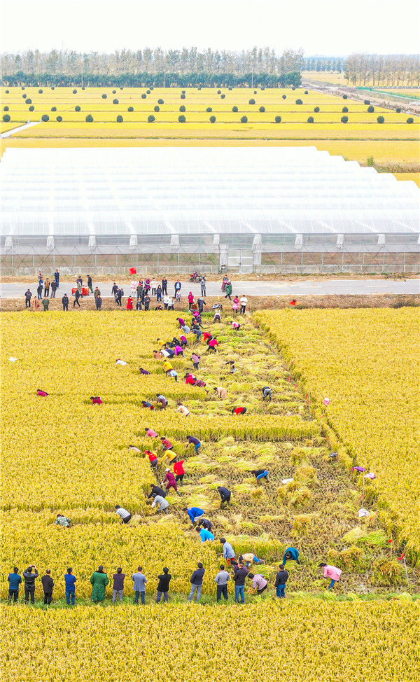 2019年10月26日,江蘇省宿遷市泗洪縣在稻米小鎮石集鄉舉行具有地方特色的割稻比賽,近60名選手在金色稻田揮舞銀鐮、緊張角逐。
