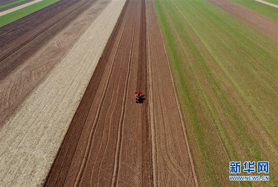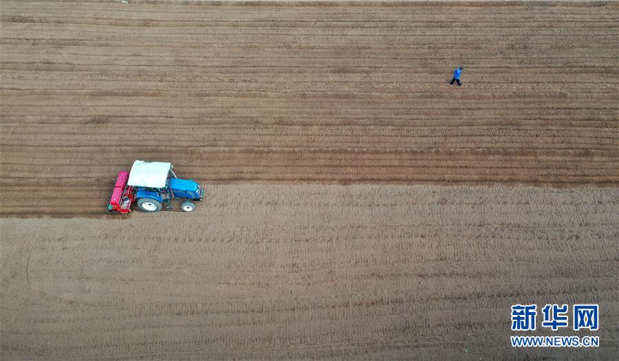 河南省寶豐縣趙莊鎮周營村農民駕駛機械在農田里犁地(10月17日無人機拍攝)。