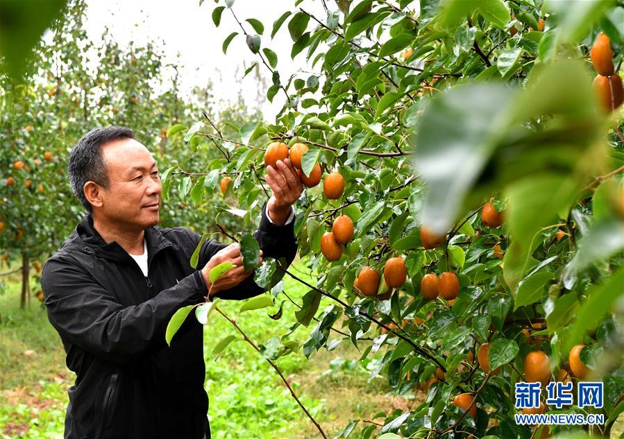 種植戶李應賢在河南省洛寧縣馬店鎮關廟村查看金珠沙梨生長情況(10月9日攝)。新華社記者李嘉南攝