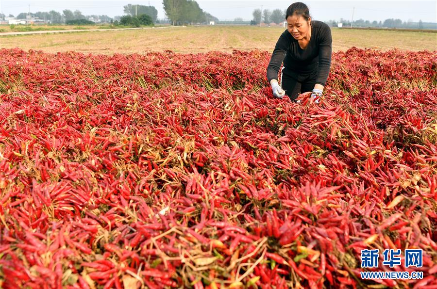河南省寶豐縣鬧店鎮周營村的村民在晾曬辣椒(10月16日攝)。