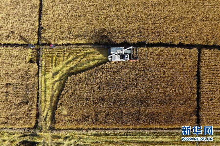 在太原市晉源區赤橋村,收割機在稻田里作業(10月28日無人機拍攝)。新華社記者詹彥攝