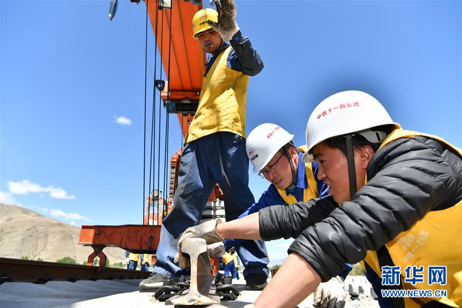6月6日,負(fù)責(zé)鋪軌的中鐵十一局集團(tuán)的建設(shè)者在現(xiàn)場作業(yè)。新華社記者李鑫攝